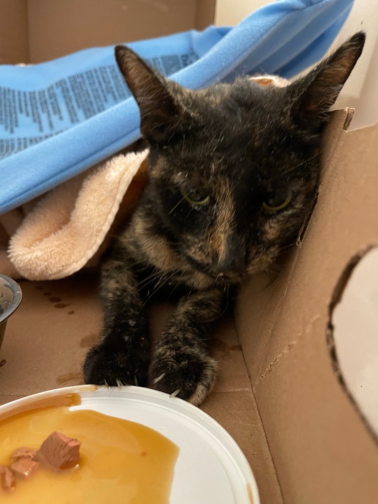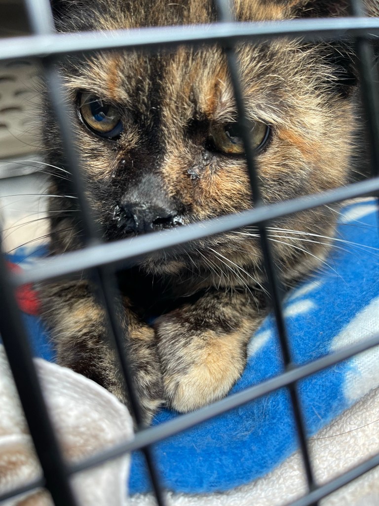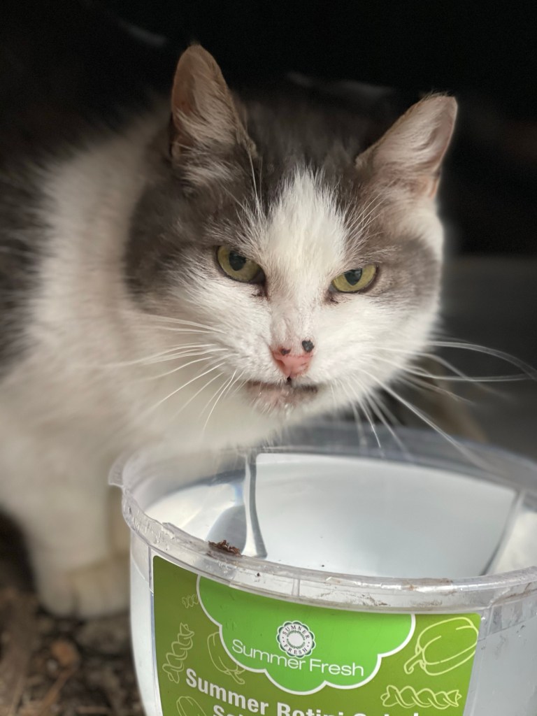 Susie had been living outside for a number of years and was TNRed in 2016 by another organization before we entered the picture. As she aged she also showed us signs of friendliness and we did everything we could to rescue her off the street, but her TNR experience had traumatized her and prevented her from re-entering a trap. This was a complicated situation as the location of the colony was a very busy Toronto intersection and many members of the public knew about the “strays“. Controlling when and where the cats are fed is imperative when trapping and we faced a challenge that people always left food for them. After a few years of earning her trust we were able to feed her inside a cat carrier and that is how she was rescued in December 2020. We brought her to another rescue where she happily resided with bonded cats Lenny and Baboo, all retired from outside. Susie was diagnosed with hyperthyroidism and received treatment. If she had not been returned back to the street when she was caught years ago, there is no doubt her chances of living a better quality of life would have been greater, illnesses caught earlier. In June 2022 she came to live with us at New Cat City for close monitoring when her health began to go downhill. We said goodbye to her forever in November 2022.